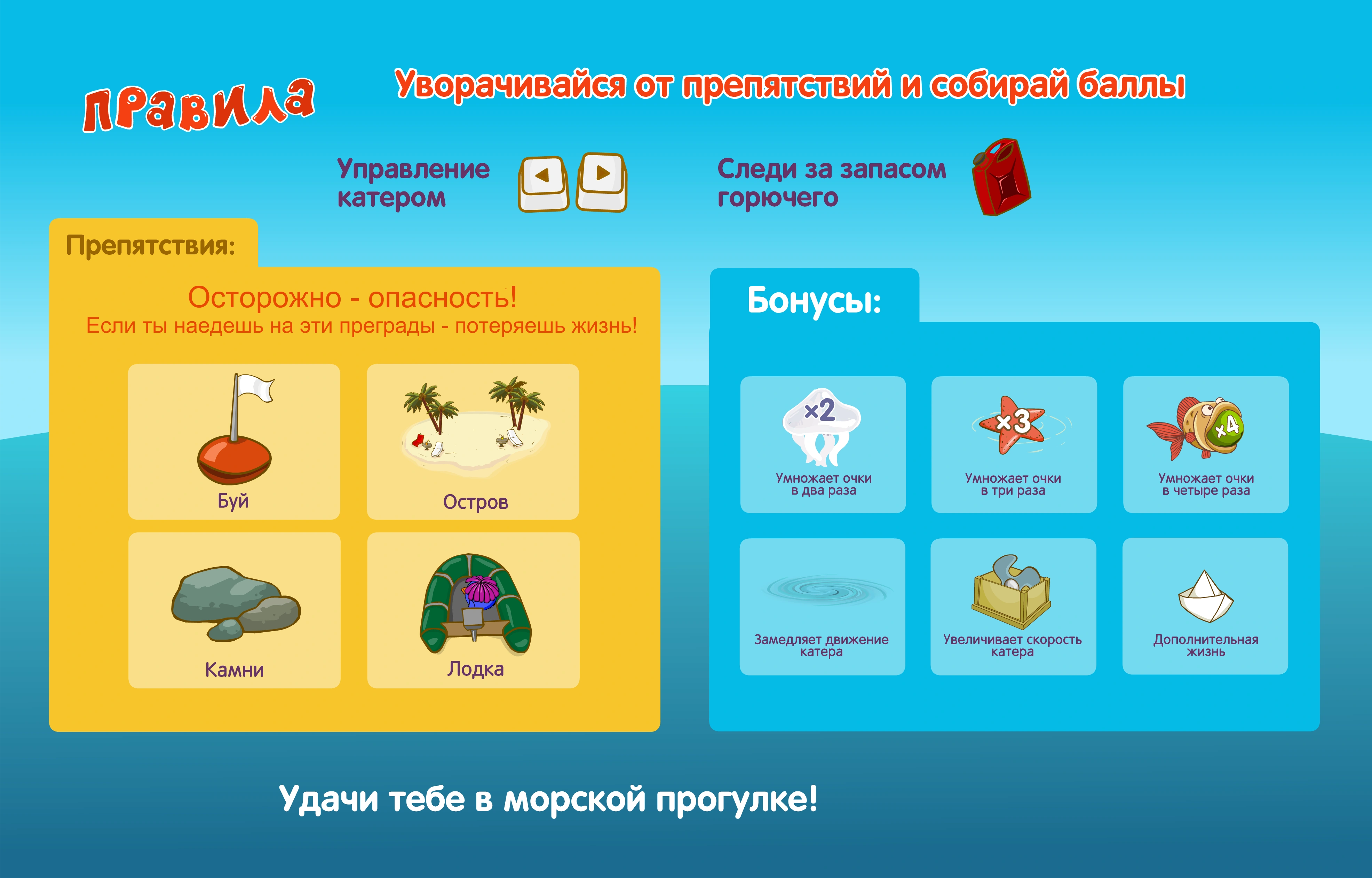 - Ящик с инструментами. Если проплыть по нему, то скорость катера увеличивается на 15 единиц;